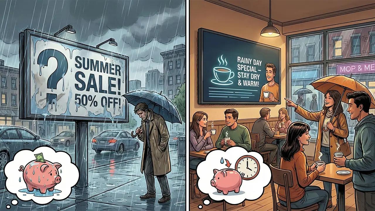 When it is raining, indoor dwell time increases significantly. People stay longer in their favorite coffee shops and take more time in clinics, creating a "Wait Time Goldmine." This is where DOOH (Digital Out of Home) analytics reveal the massive ROI gap. You aren’t just reaching "more people"; you are reaching people who have the time, the comfort, and the mental bandwidth to actually process and recall your message.
